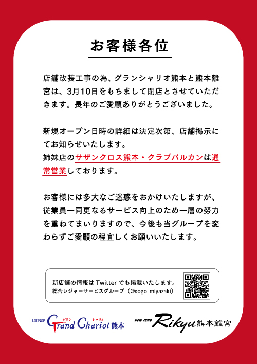 3月10日 グランシャリオ熊本 熊本離宮 閉店のお知らせ 熊本 総合レジャーサービスグループ